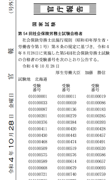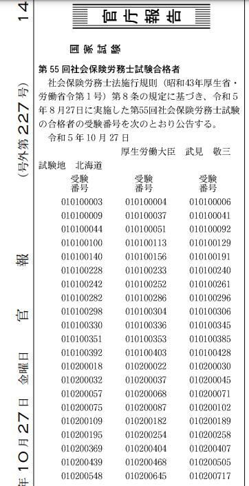 官報に受験番号が掲載されること
